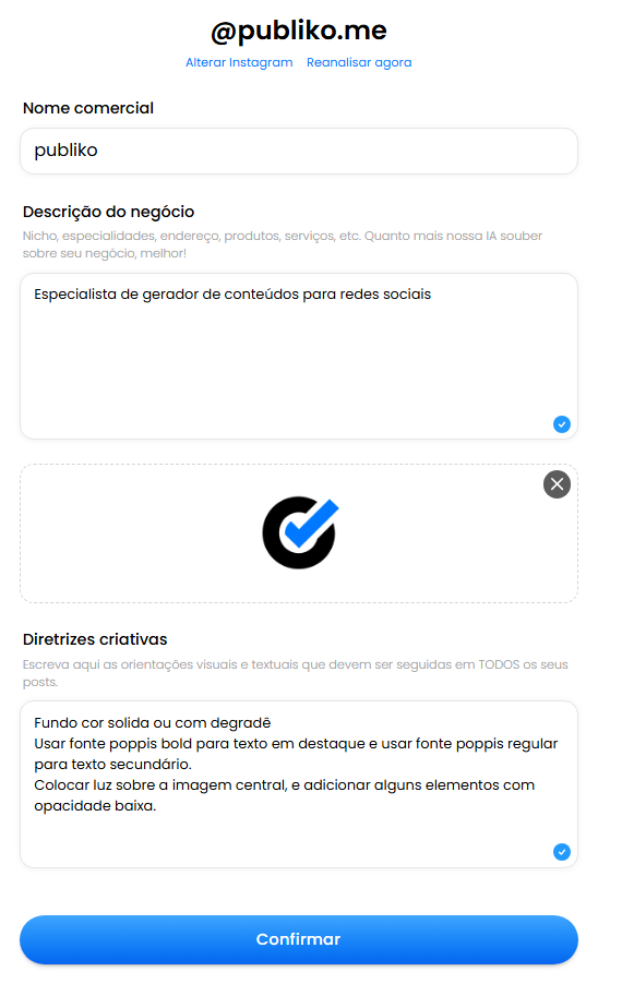 Nesse espaço, você poderá definir as diretrizes criativas dos seus posts, como adicionar sua logo, informar sua especialidade e indicar como deseja que os conteúdos sejam criados. Dessa forma, as publicações ficam mais alinhadas à identidade do seu negócio.